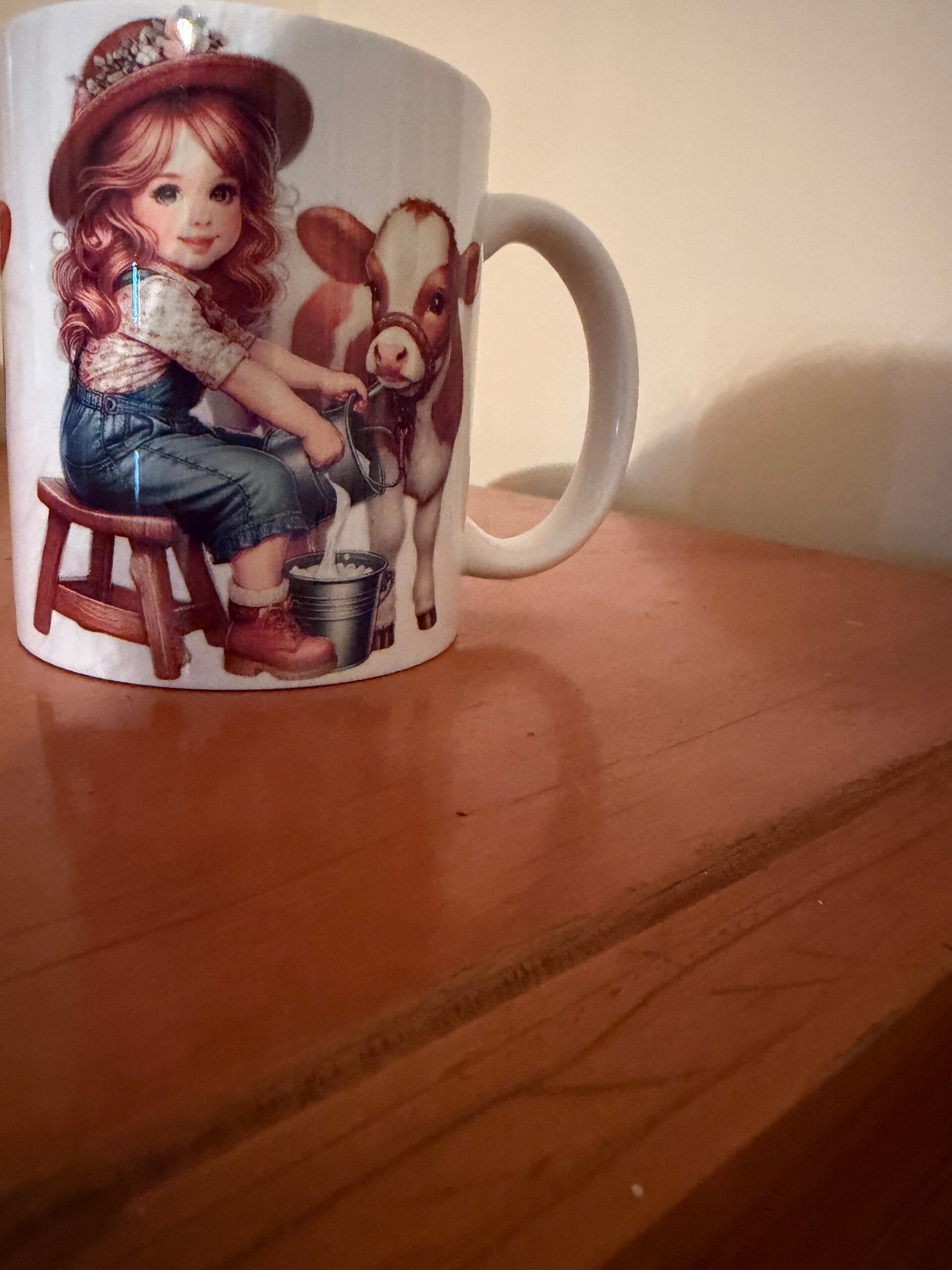 A beautiful unique country little girl feeding her calf 11oz coffee mug